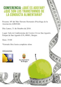 Queremos invitaros el próximo lunes, día 31 de octubre a la conferencia: ¿Qué es ADEFAB?¿Qué son los TCA? que tendrá lugar en la sala de